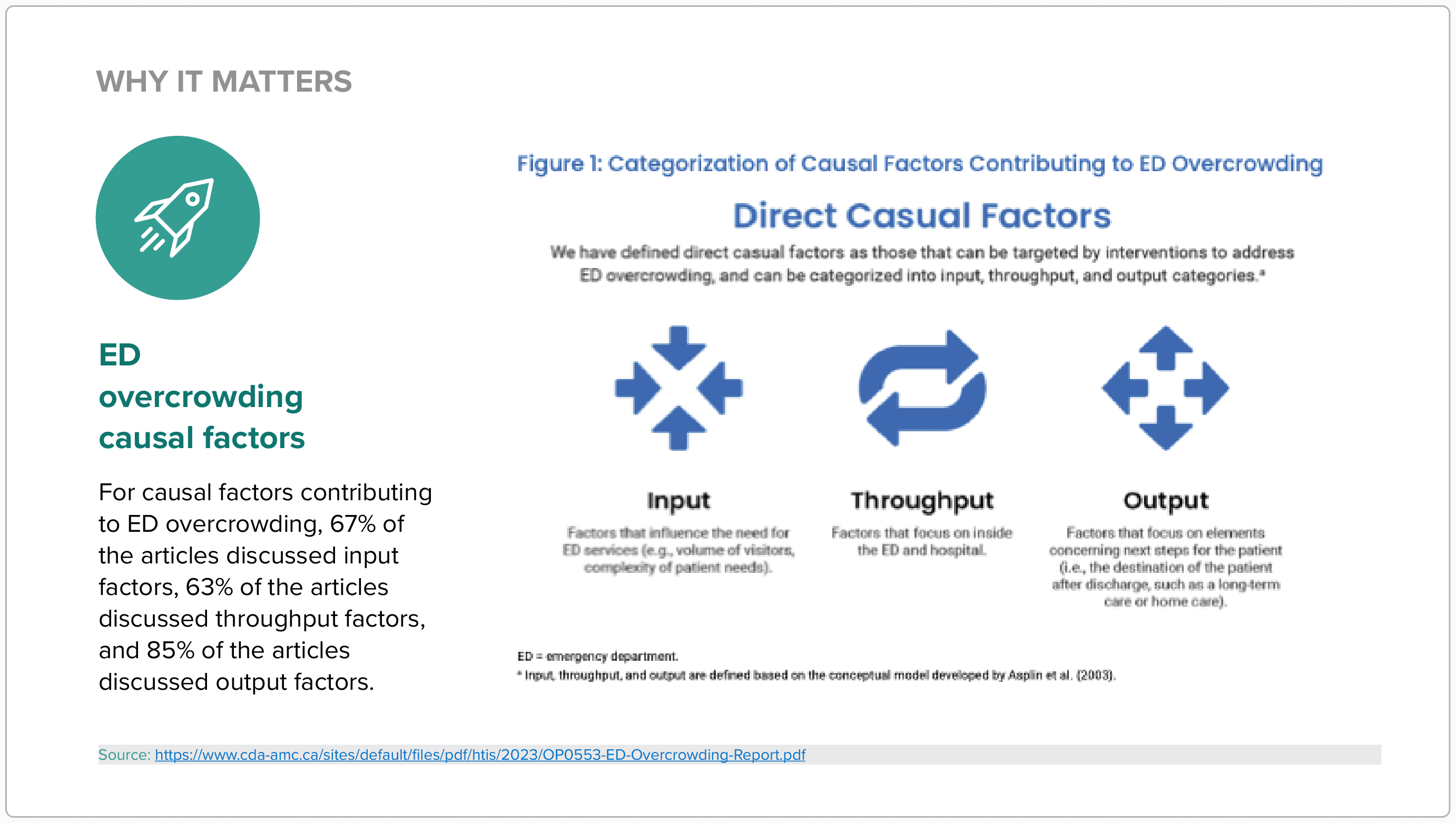 ER overcrowding isn’t caused by a single failure point; it’s driven by pressures that can be broken down across input, throughput, and output. A 2023 assessment shows: